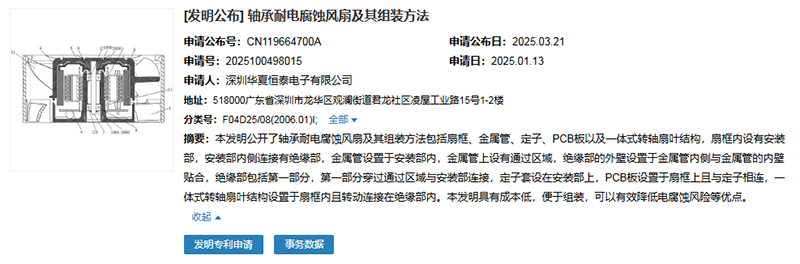 深圳華夏恒泰電子有限公司申請(qǐng)一項(xiàng)名為“軸承耐電腐蝕風(fēng)扇及其組裝方法”的專利,